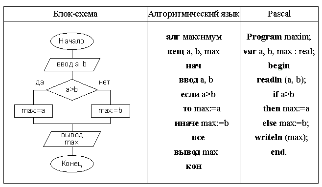 В качестве примера рассмотрим алгоритм нахождения максимального из двух