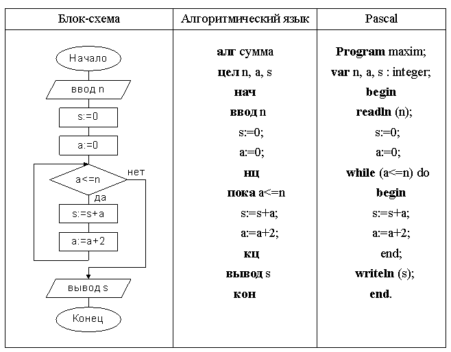 блок-схемы, в виде программы на алгоритмическом языке и на языке Паскаль.