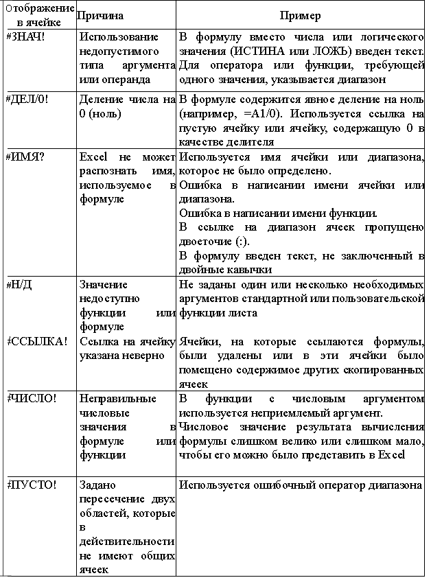 ошибки и некоторые возможные причины их появления приведены в таблице.