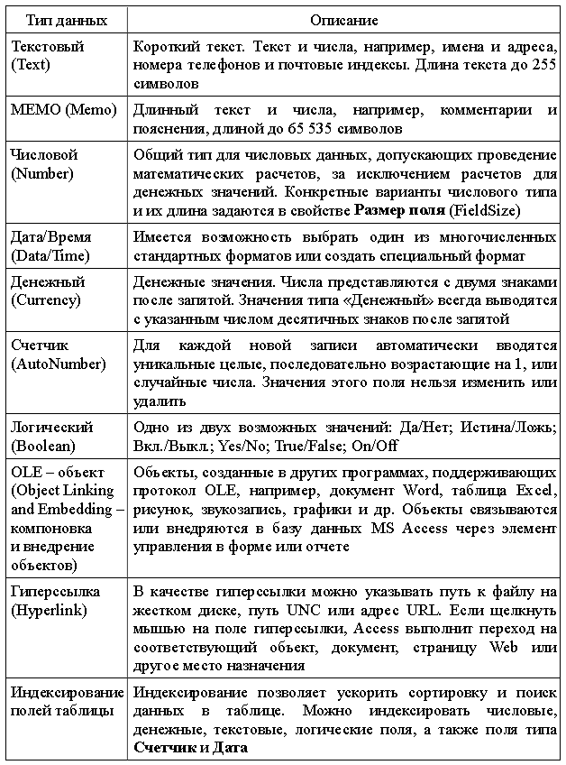 Типы данных, используемые в Microsoft Access, приведены в таблице
