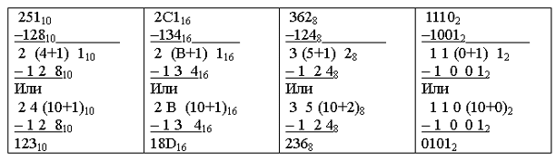 чисел 251 – 128, вычитают отдельно соответствующие разряды и, при необходимости,